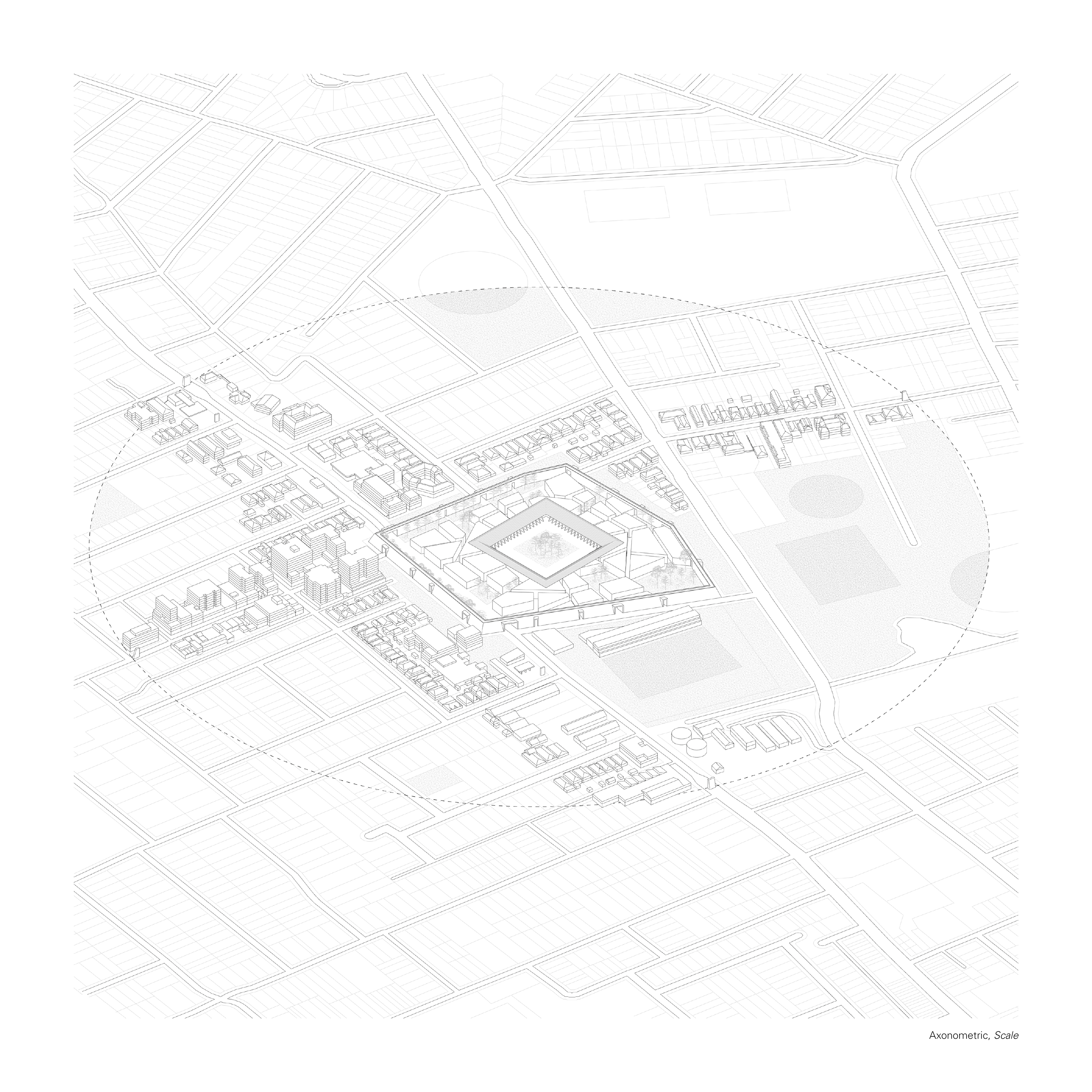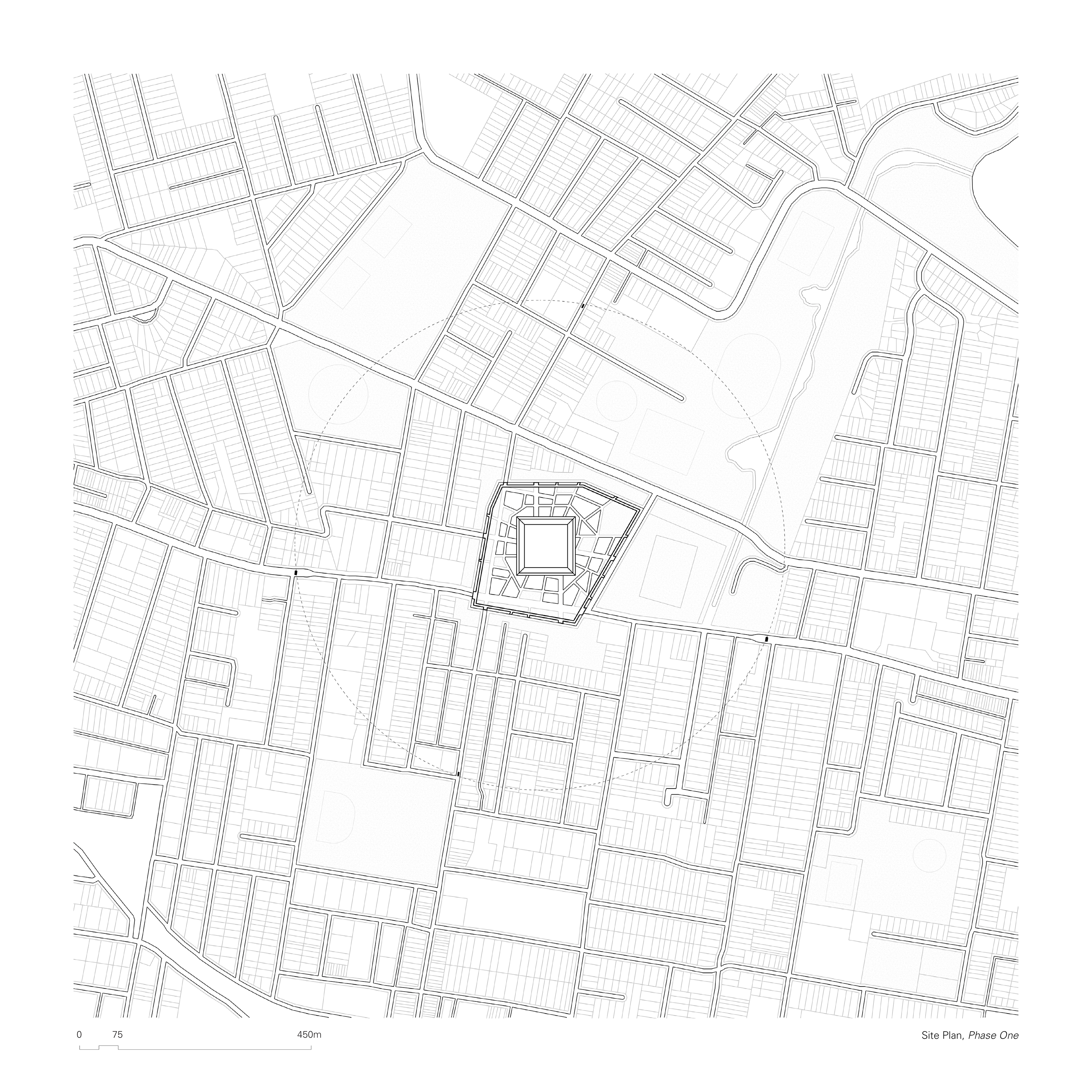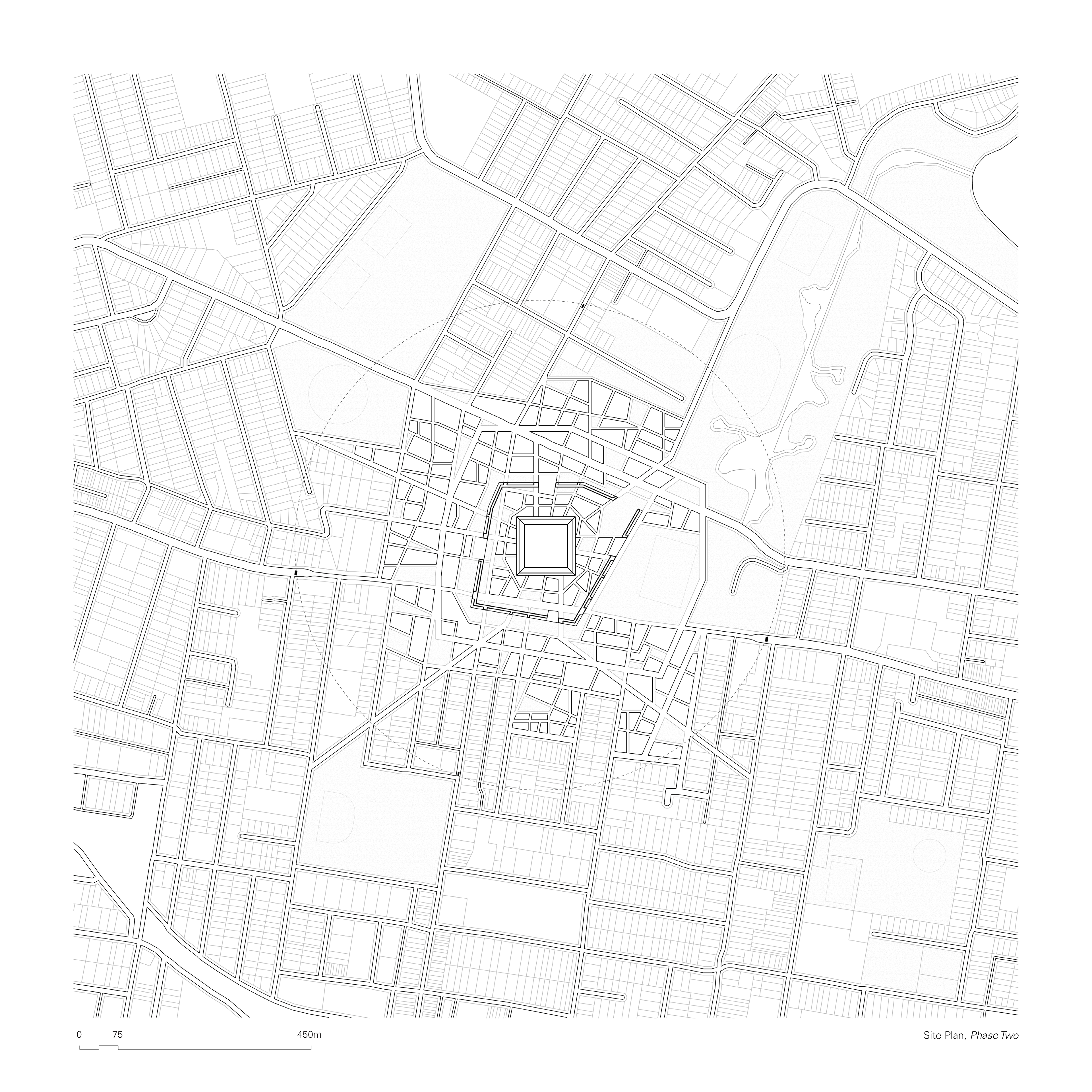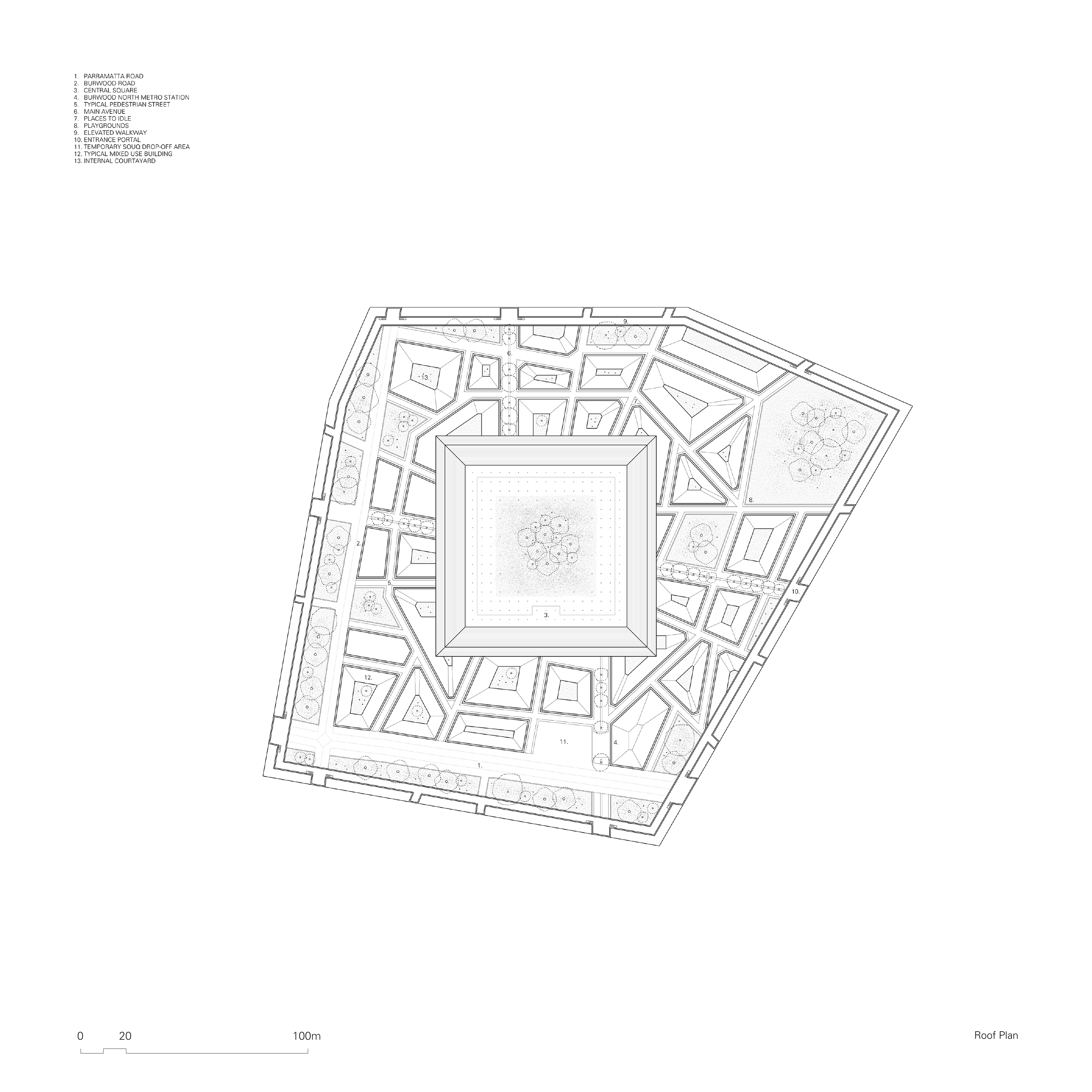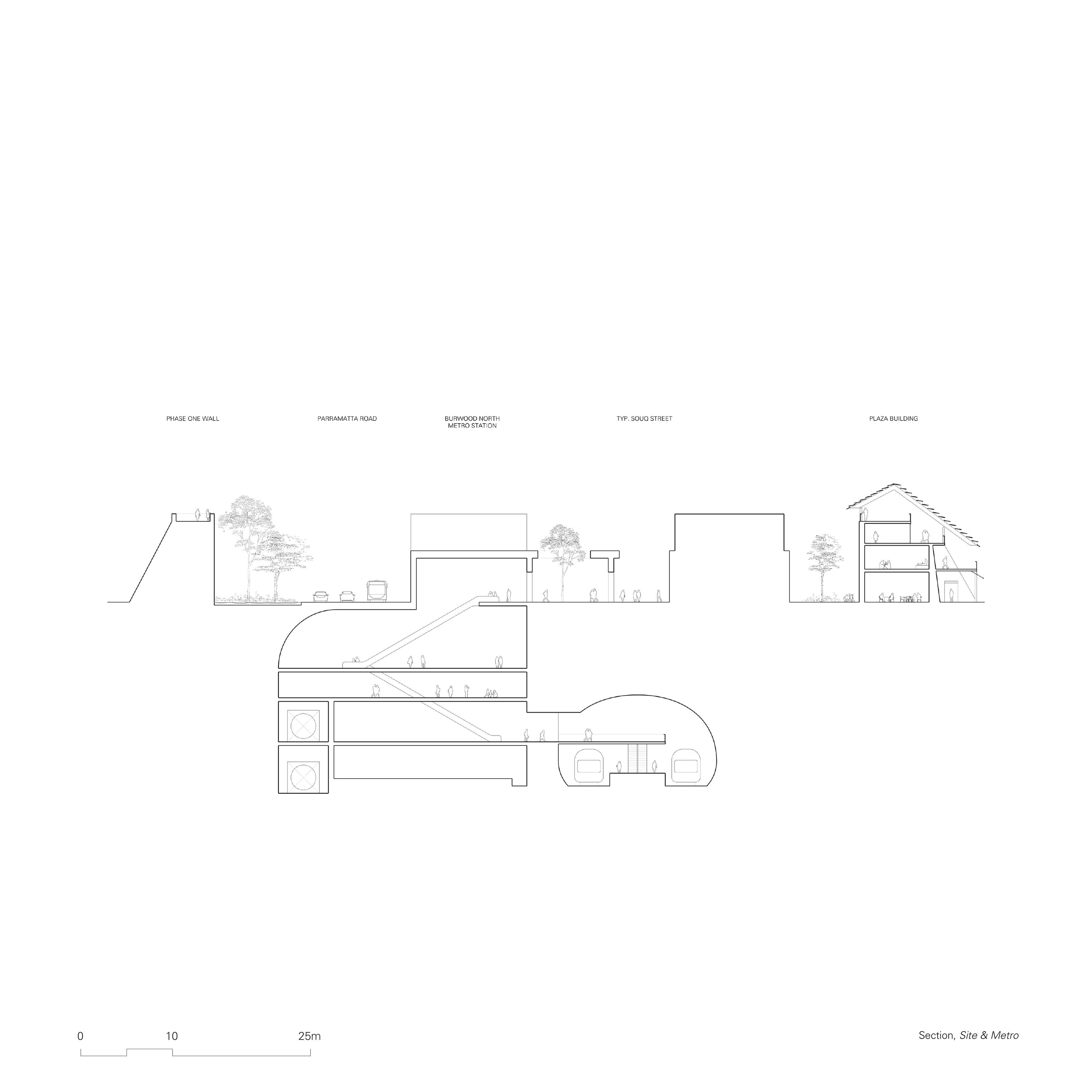 The initial intervention proposes a walled zone which encapsulates the chosen site, in an attempt to convert it from a traffic diverging point to a central node, by acting as a physical obstruction that interrupts, restricts and alters traffic flow. The Wall acts as a piece of protective infrastructure for the incubation of a localized economic center. At the center of the proposal will be a large public courtyard, a landscape area which takes cues from civic squares and translates them through a distinctively Australian lens. The interplay between the focal object (the Square) and the frame (the Wall) creates a porous in-between, an intricate network of pathways that create unique building footprints, to be occupied as a souq and its supporting infrastructure. The geometrical purity of the Square elevates its symbolic and social status within the development, in constant dialogue with the enclosing Wall, which instead moulds its geometry to the existing fabric.