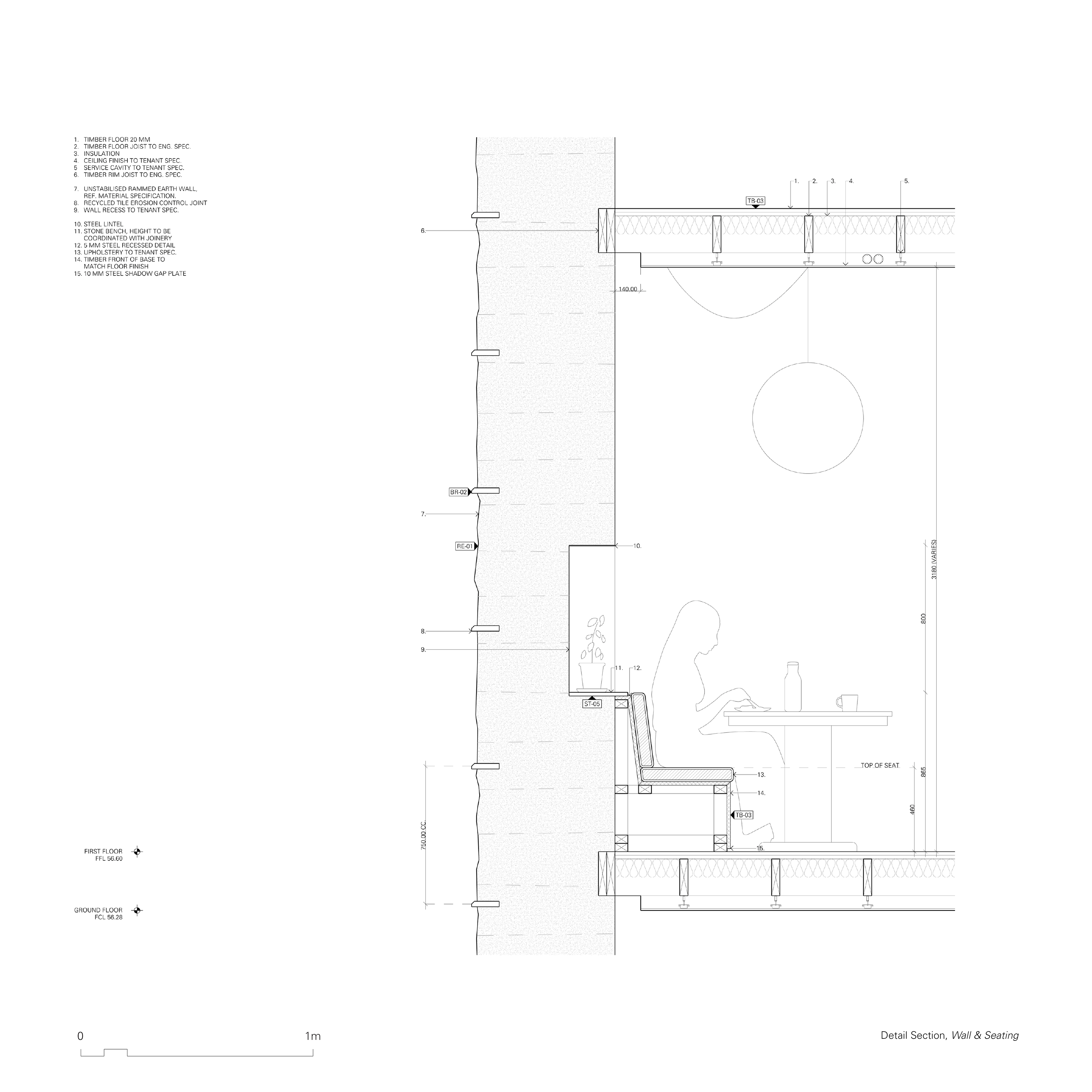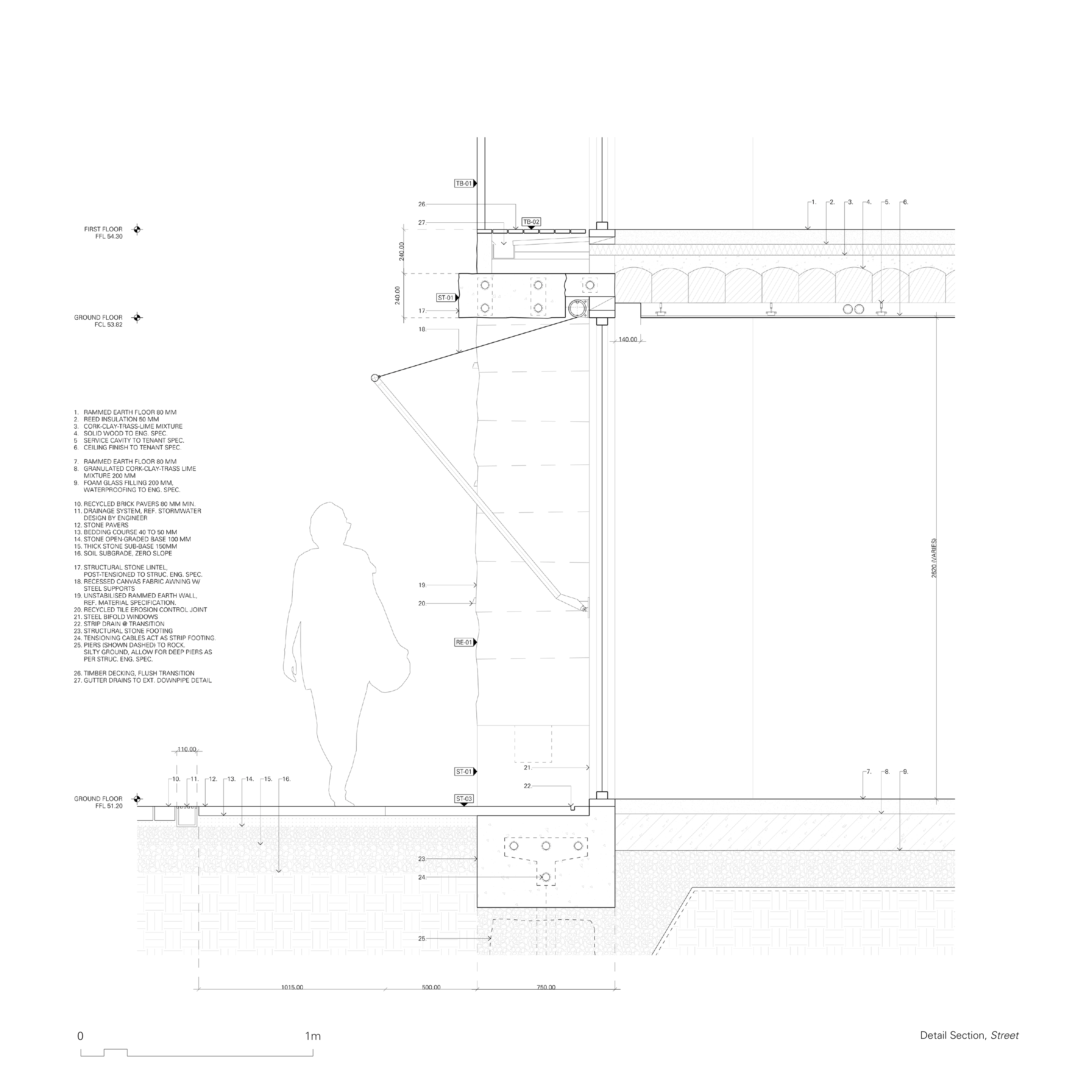 Post tensioned stone utilises the materials strength in compression to form beams, in a similar way to post tensioned concrete. Often discarded during excavation, stone is an abundant material that can be elegantly expressed through processing procedures and engineered to achieve large spans and form foundations. Both post tensioned stone and rammed earth are construction methods that enable an expression of place through materiality.