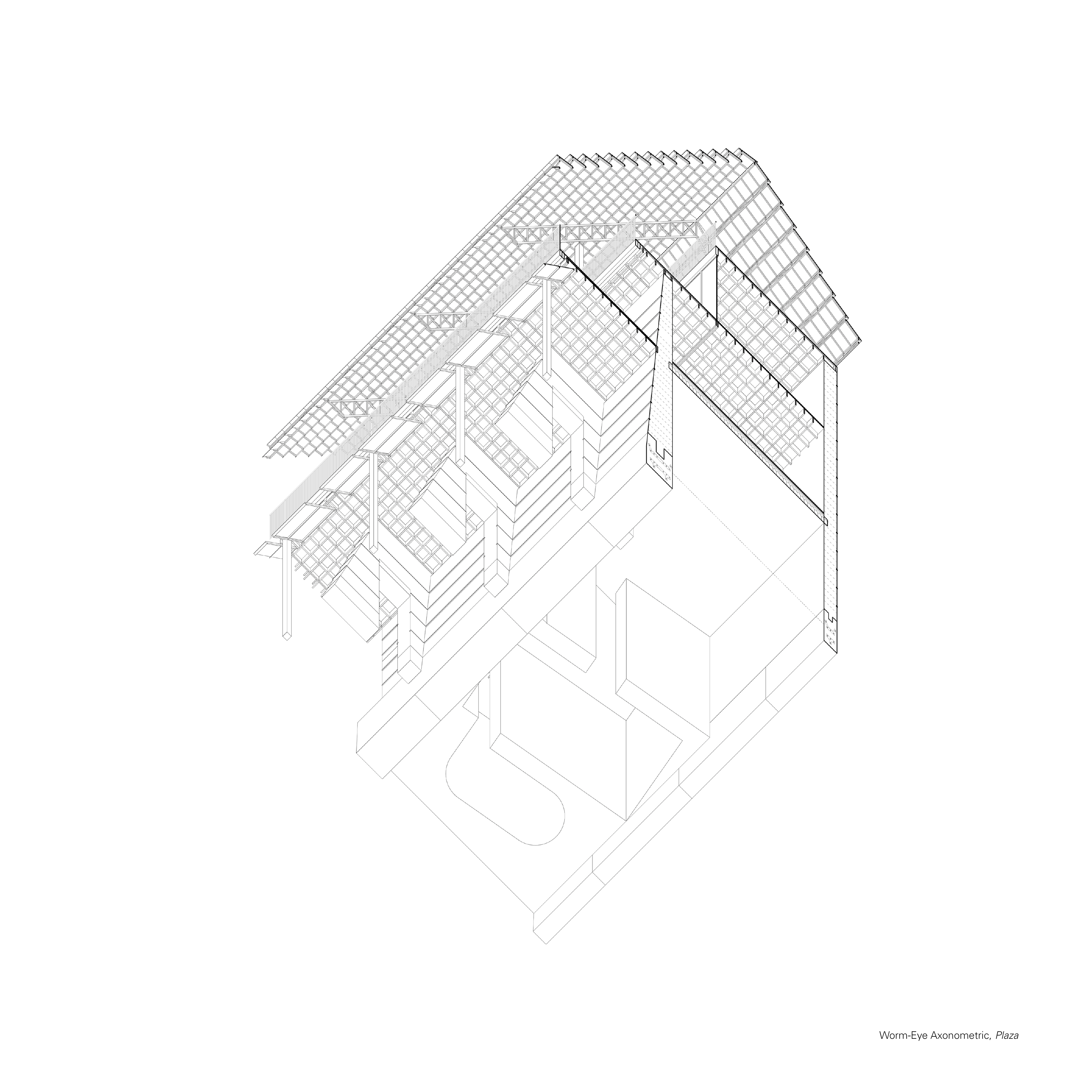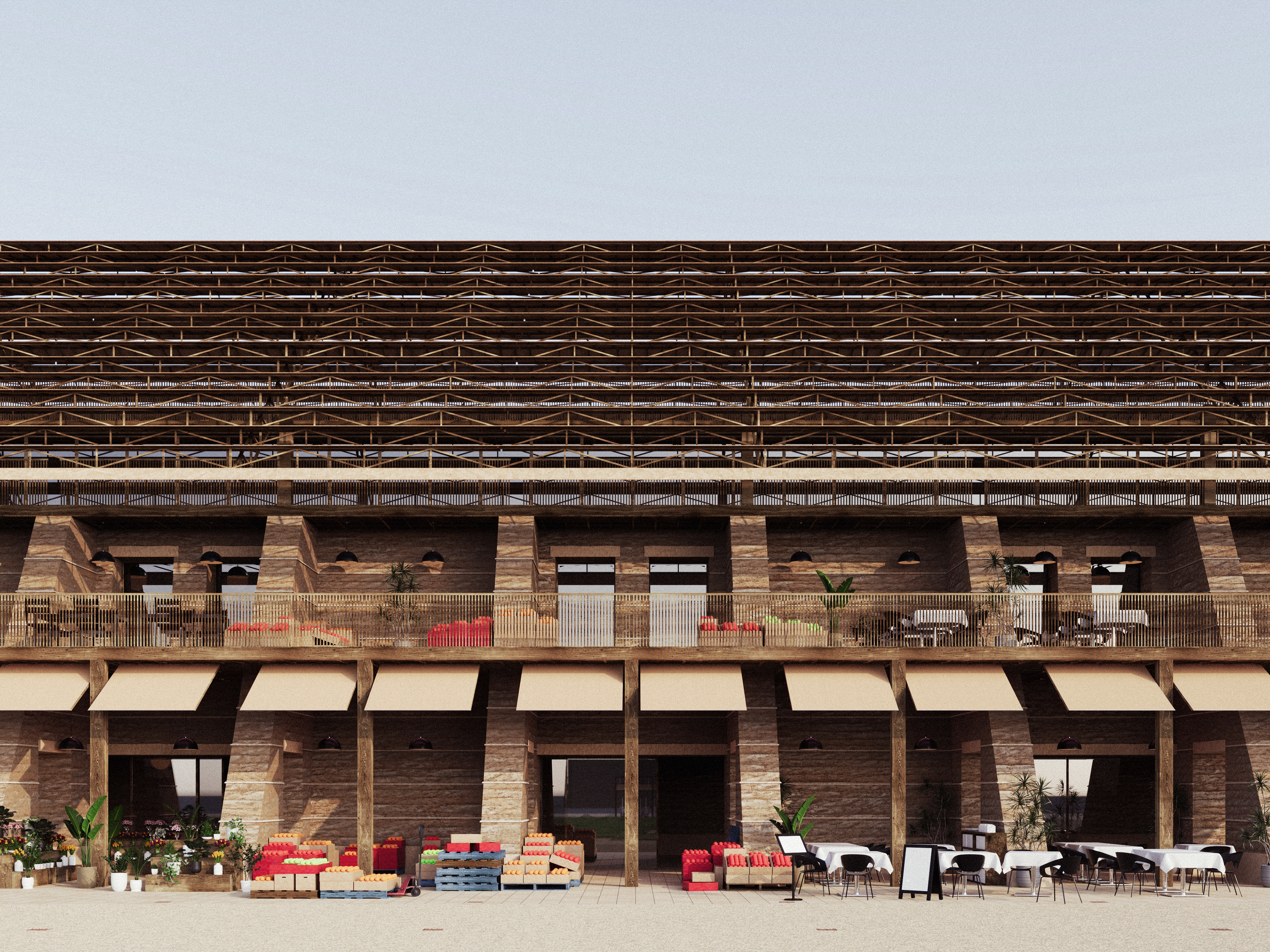 The space between the blades can be inhabited by the stores operating in the spaces in the wall. On the ground floor and first floor of the wall, spaces are carved into the rammed earth. In plan, the layout responds to the three grids previously mentioned, embedding the building to the site and creating a unique spatial experience in each room. The ground floor is suited for market spaces benefiting from interaction with public foot traffic, such as food and beverage, fresh produce and retail, whereas the first floor, elevated from the public square, is more suited for intimate dining and smaller scale trade. The irregular shapes produce a variety of interior conditions over multiple storeys, which are open to interpretation by merchants and store holders. Amenities which service the public plaza are also contained within this structure.
