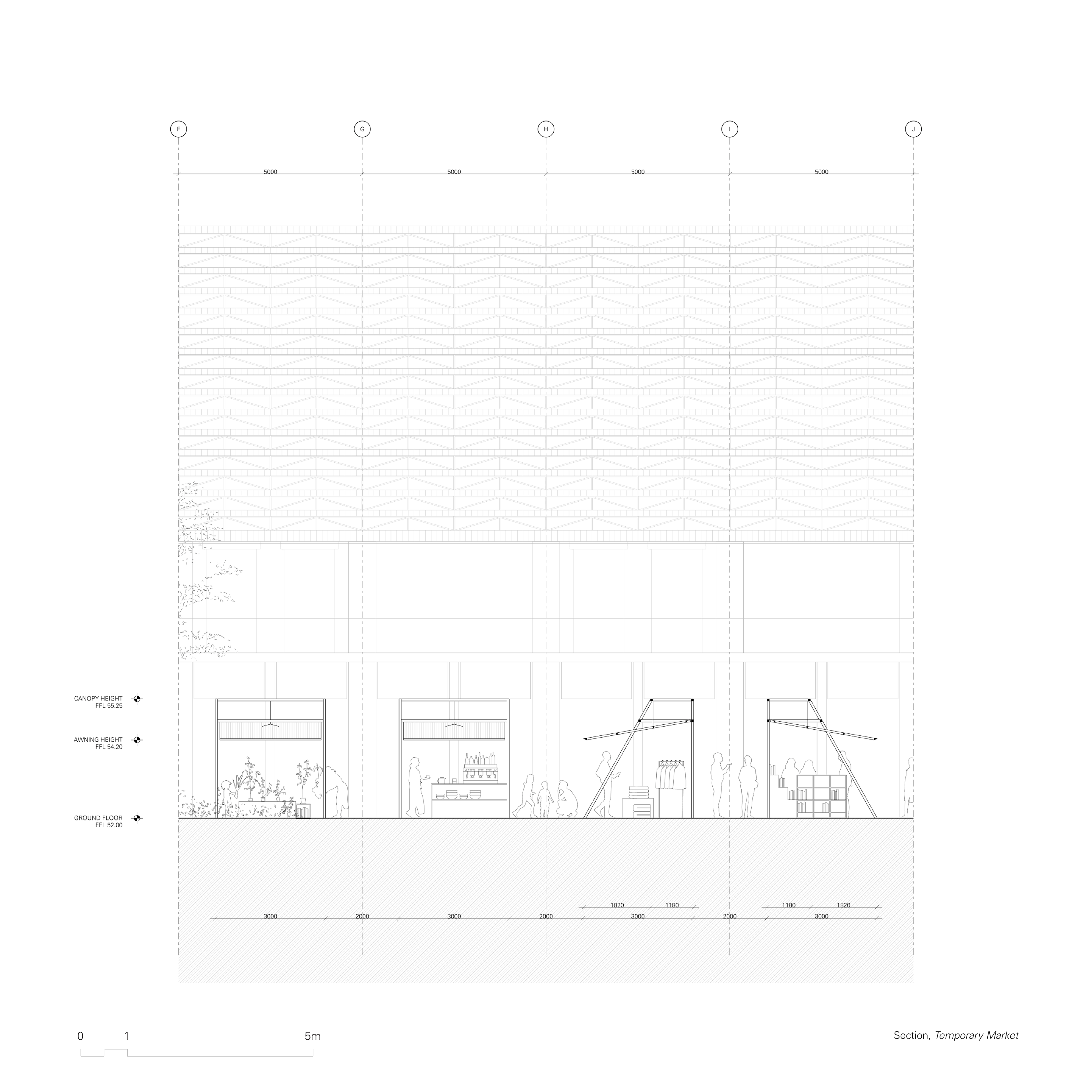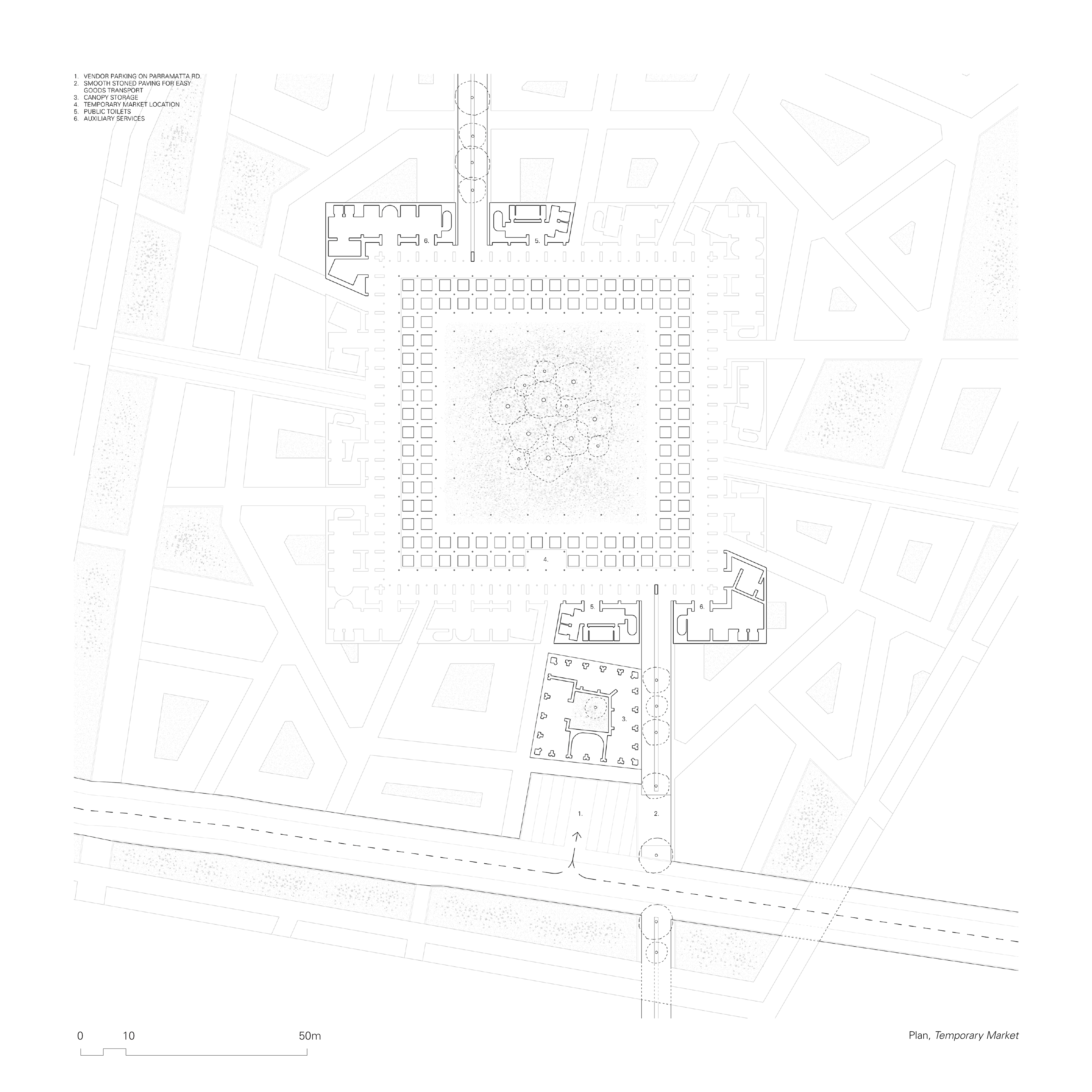 Vehicles will be able to park along the designated shared-area along Parramatta Road. Service functions required to operate the temporary market are theatrically displayed to the public both as a way to signal the presence of the market as well as a way to celebrate the added value this type of trade brings to the node. Smooth paving facilitates the transport of the goods to the plaza, with the demountable canopies stored in a building along the way. The layout of the market is pre-determined by the ground pattern, creating rows of 3 metre canopies with 2 metre walkways in-between. The corners of the Plaza building are equipped with the amenities and auxiliary services necessary for the functioning of the market.