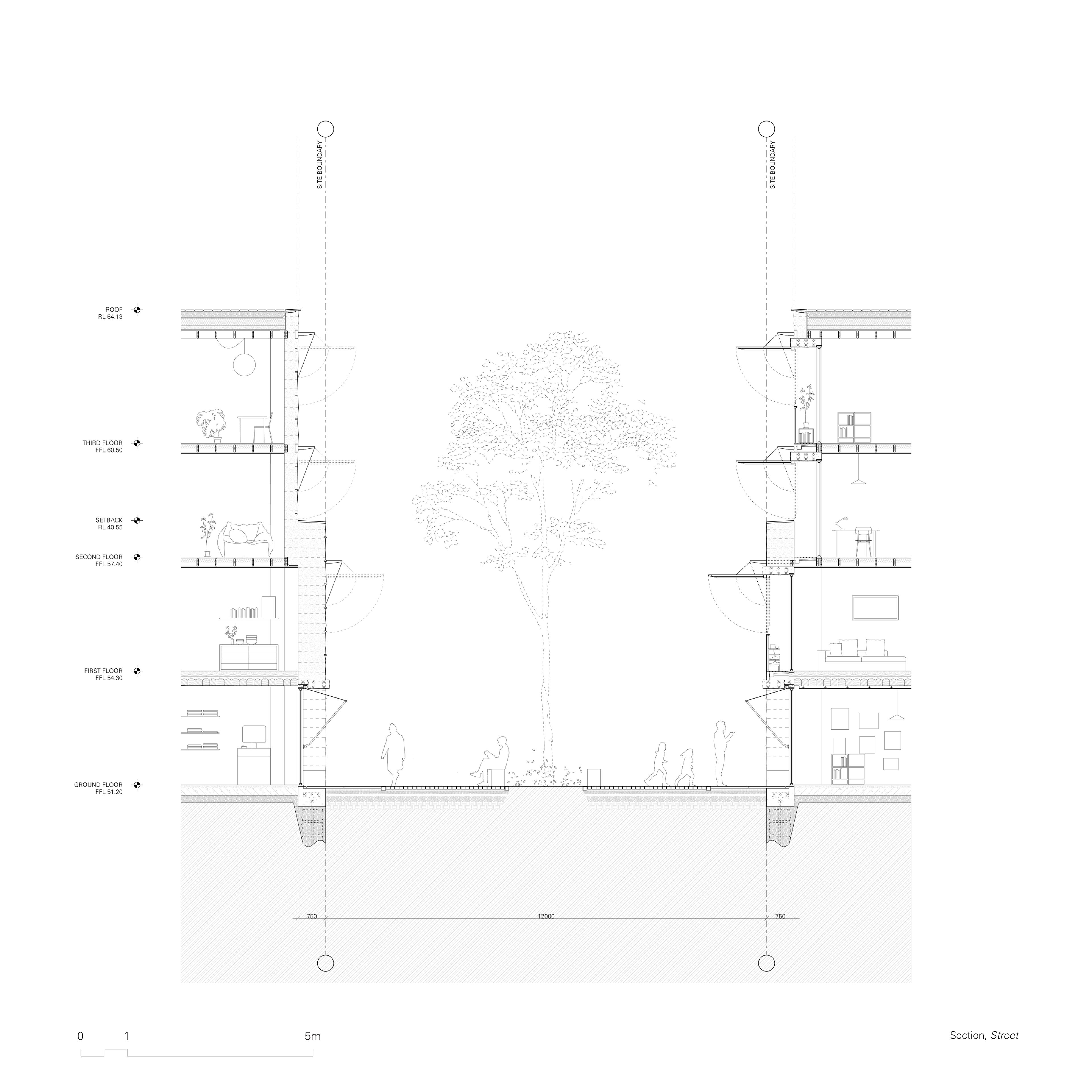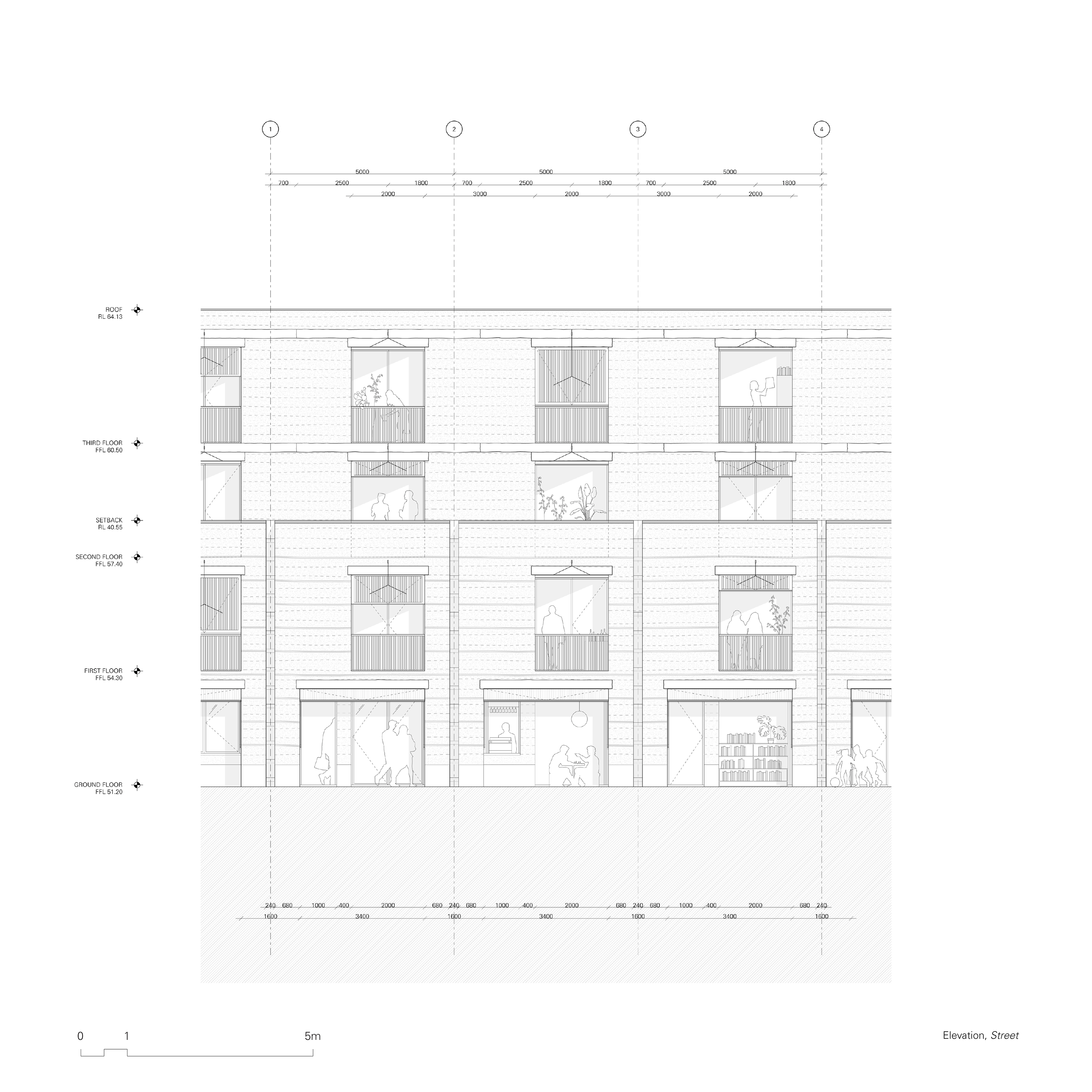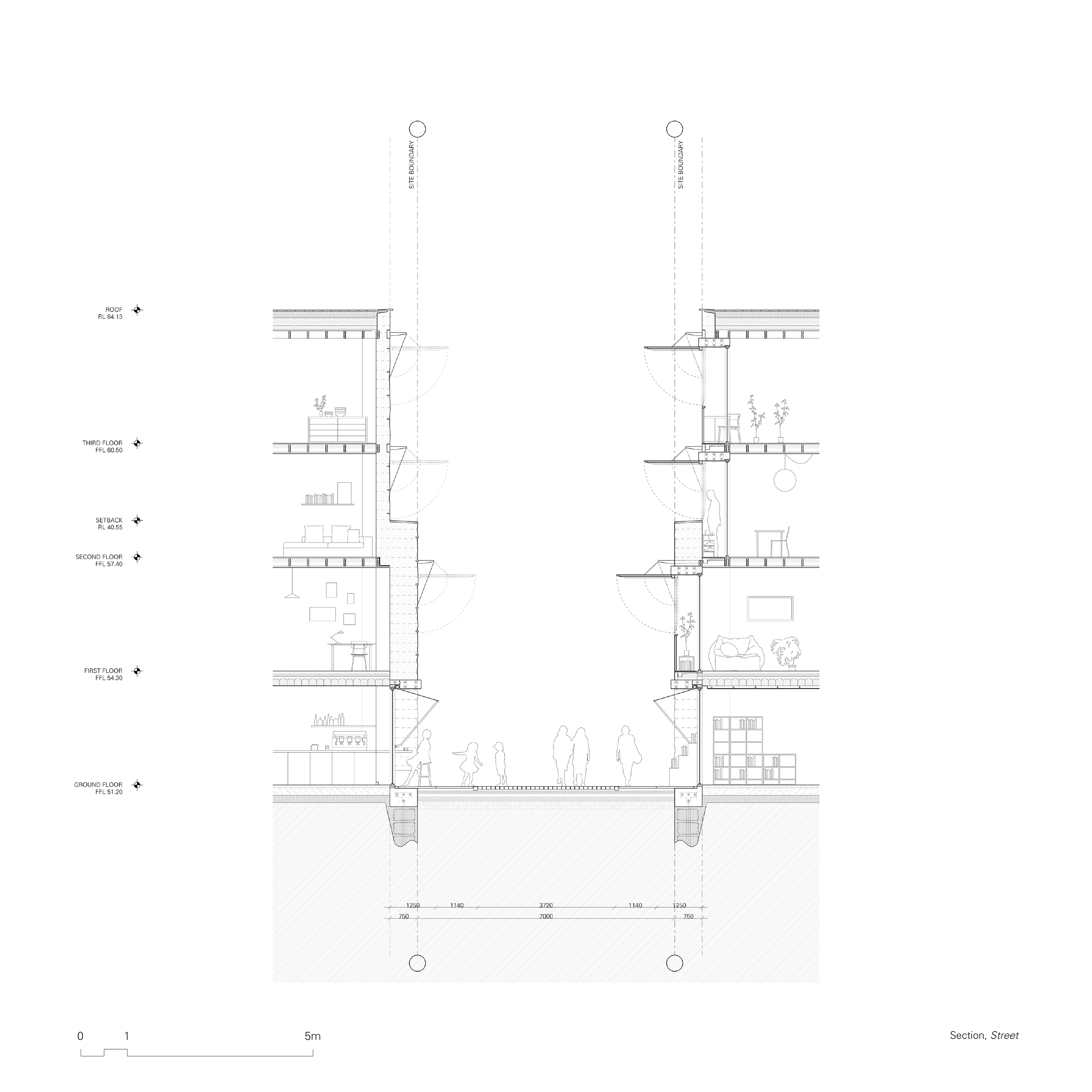 The upper levels of the street building are inhabited by the general public, and their domesticity is expressed in a similar way, slightly offset from the site boundaries. By doing so, the proposed design subtly references shopfront terrace house proportions, offering an appropriate backdrop to the scale of the street.