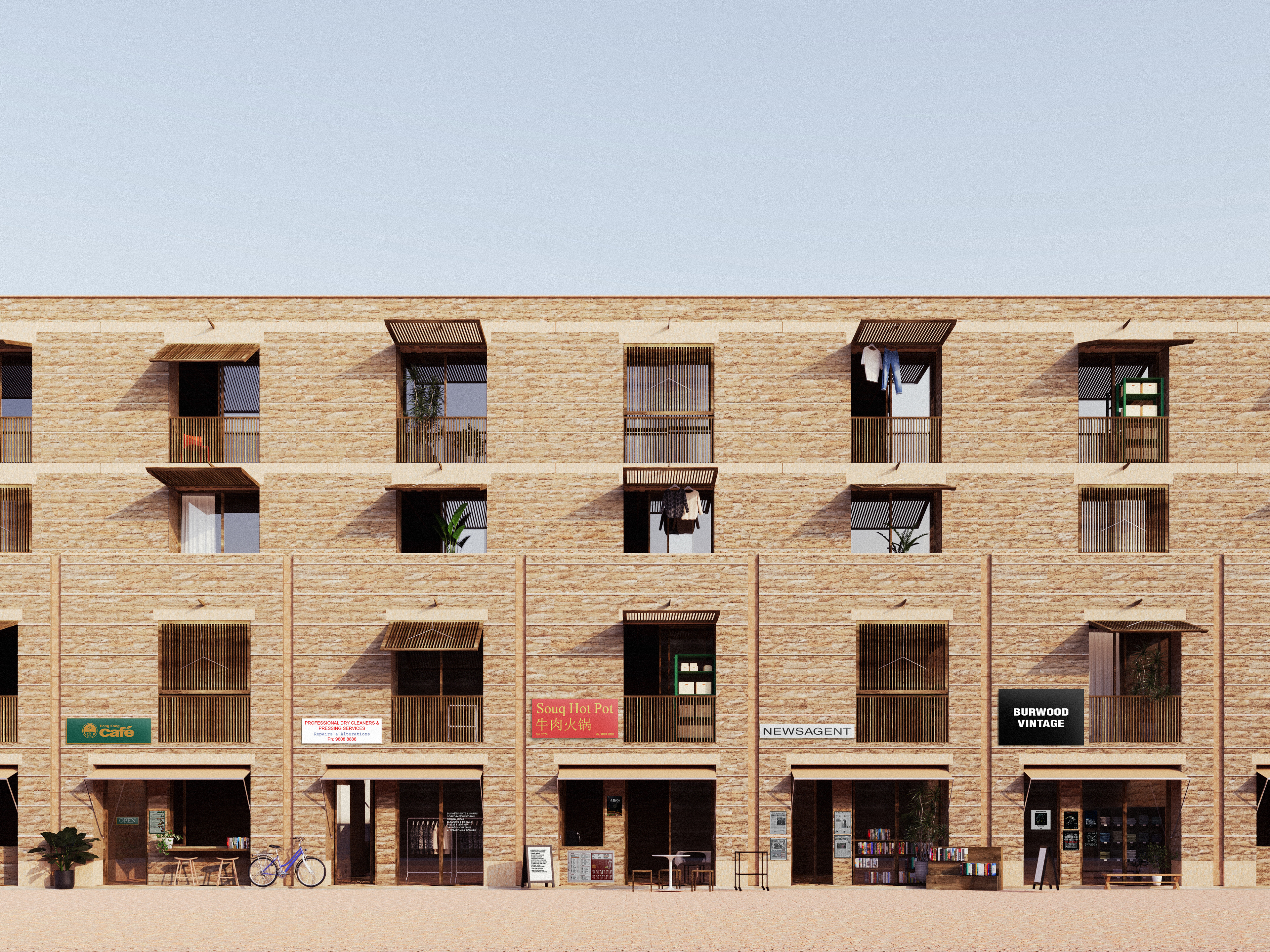 The ground facades of the proposal are composed as thick, rammed earth walls. The depth of the walls enable them to be lightly inhabited in a way that is expressive and almost performative towards the street and the neighbourhood. Souq spaces on the ground floor inhabit the walls in the same manner as domestic spaces on the level above, where the merchants of the souq beneath reside. The chosen slab construction method helps to prevent unwanted noise from entering the homes, as well as providing a strong structure for diverse types of retail ceiling fit outs.