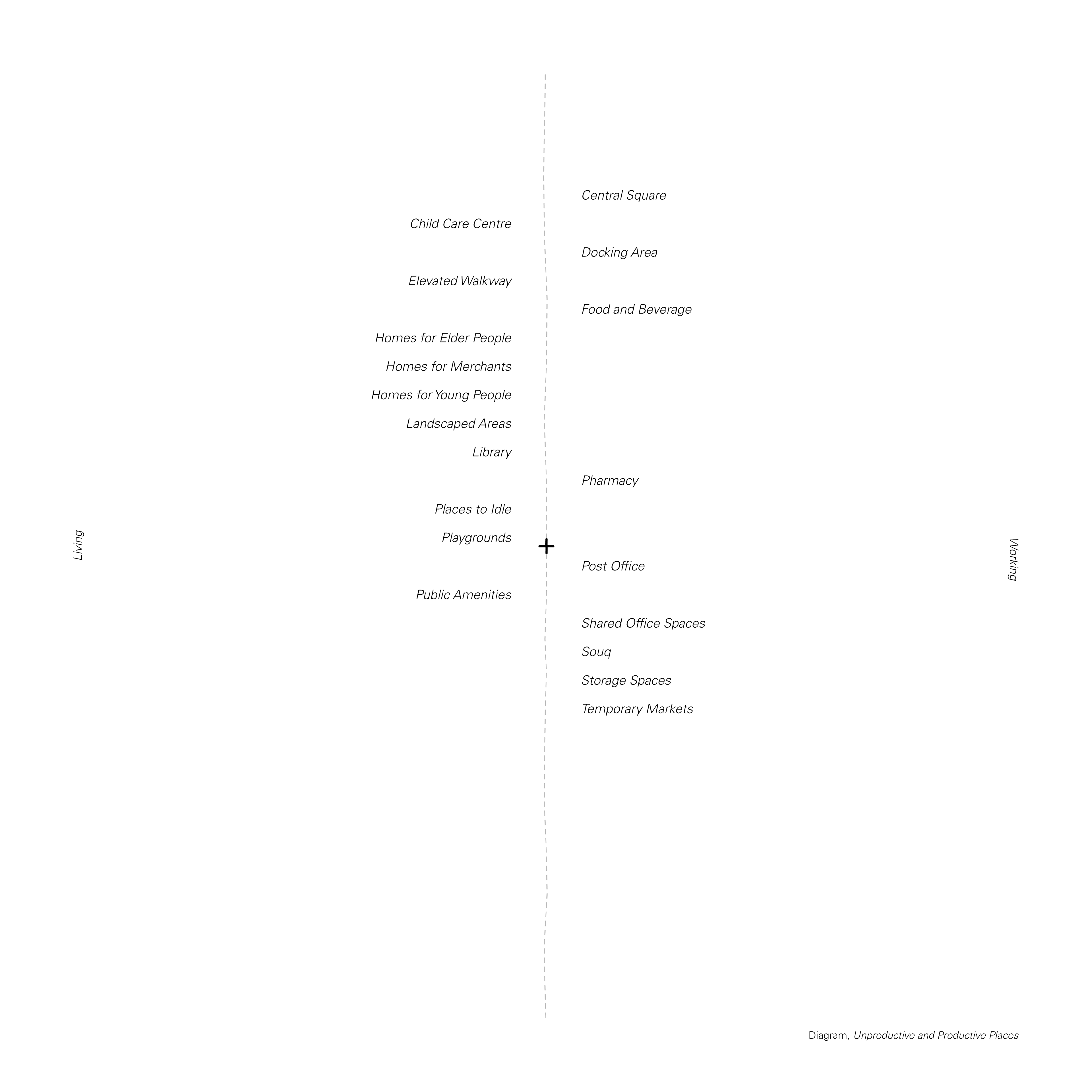 Aureli and Tattara concur on the fundamental complicity of our built environments in the perpetration of societal binarisms: male/female, breadwinner/housewife, private/public, productive/unproductive. Indeed, the commodification of the household as a spiritual retreat has divided the tasks necessary to live along the binary of commercial capital, inexorably relegating part of the population to the home and the home only. In order to revitalize small scale businesses, we believe primary services should be radically integrated in the fabric of our cities, by breaking down outdated dichotomies between productiveness and unproductiveness, in order to facilitate a more holistic engagement with our work environments and civic spaces.