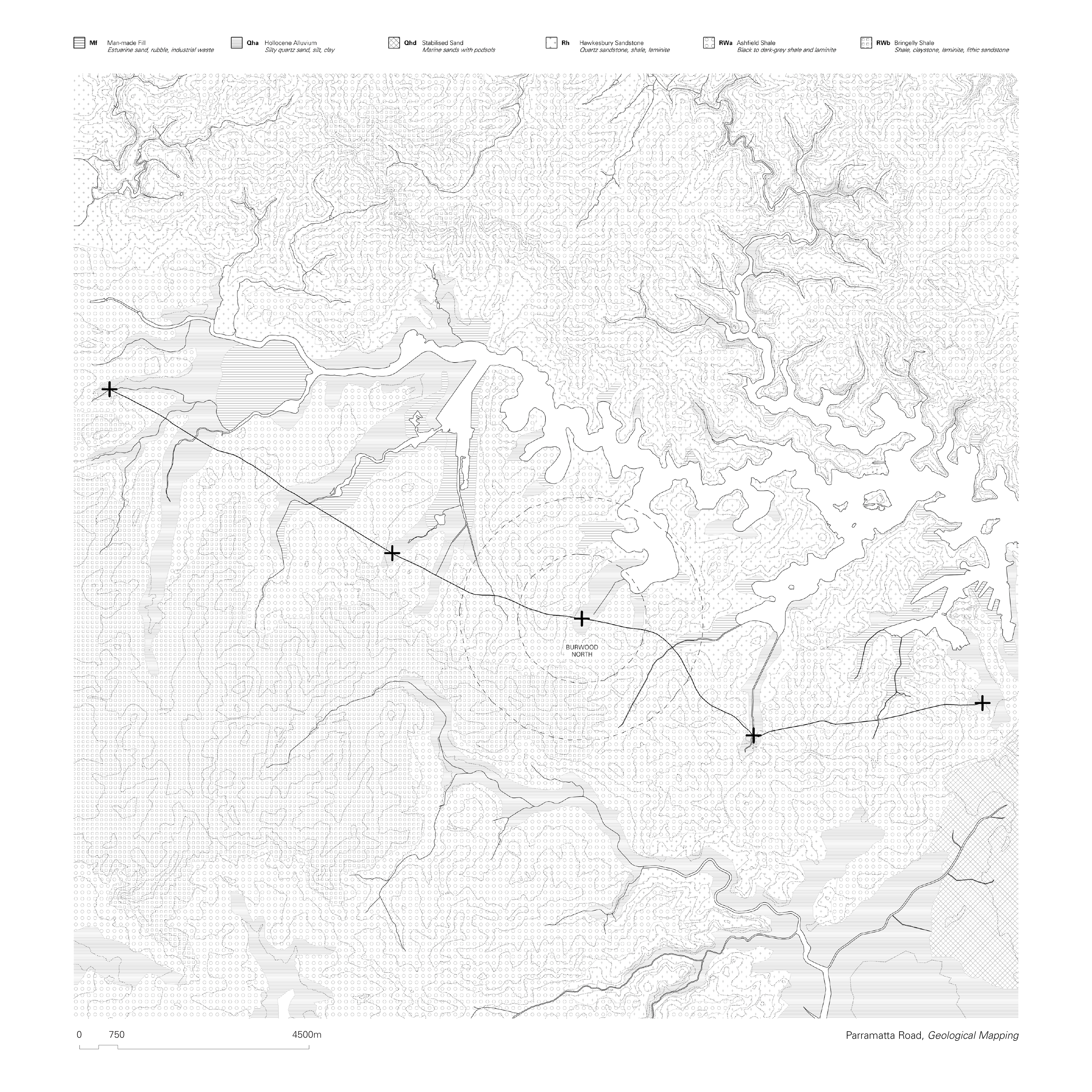 Existing a seminal mode of trade for First Nations clans for thousands of years, Parramatta Road is perhaps the oldest, active trading route in the world. While the surrounding landscape has been severely altered, historical records show us that the location of the path, following the low ridges of the area, has remained largely unchanged. The original path has been gradually – and sometimes abruptly - adapted into its current form. Analyzing the geological conditions of the site helps us understand what the harbour would have looked like prior to industrialization.