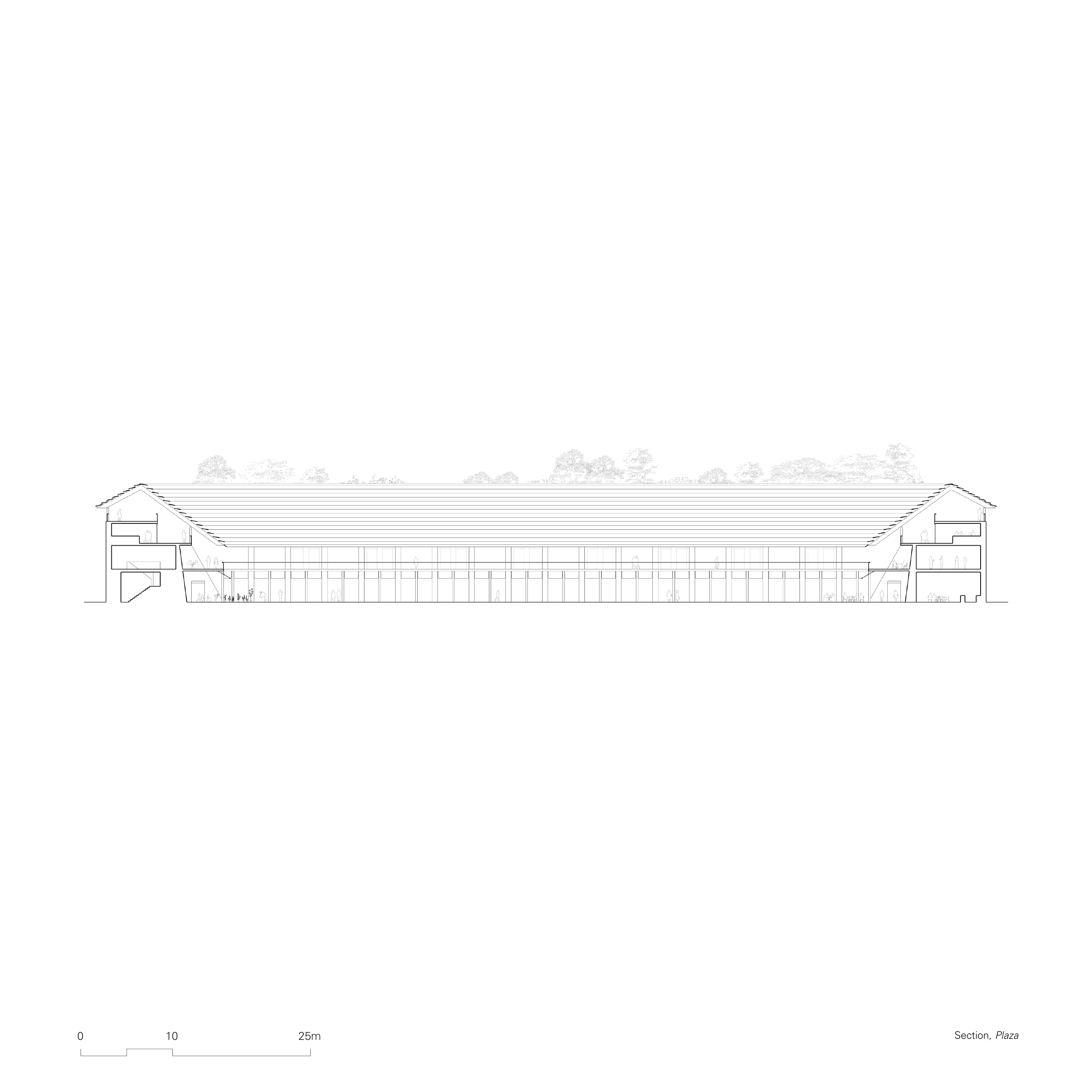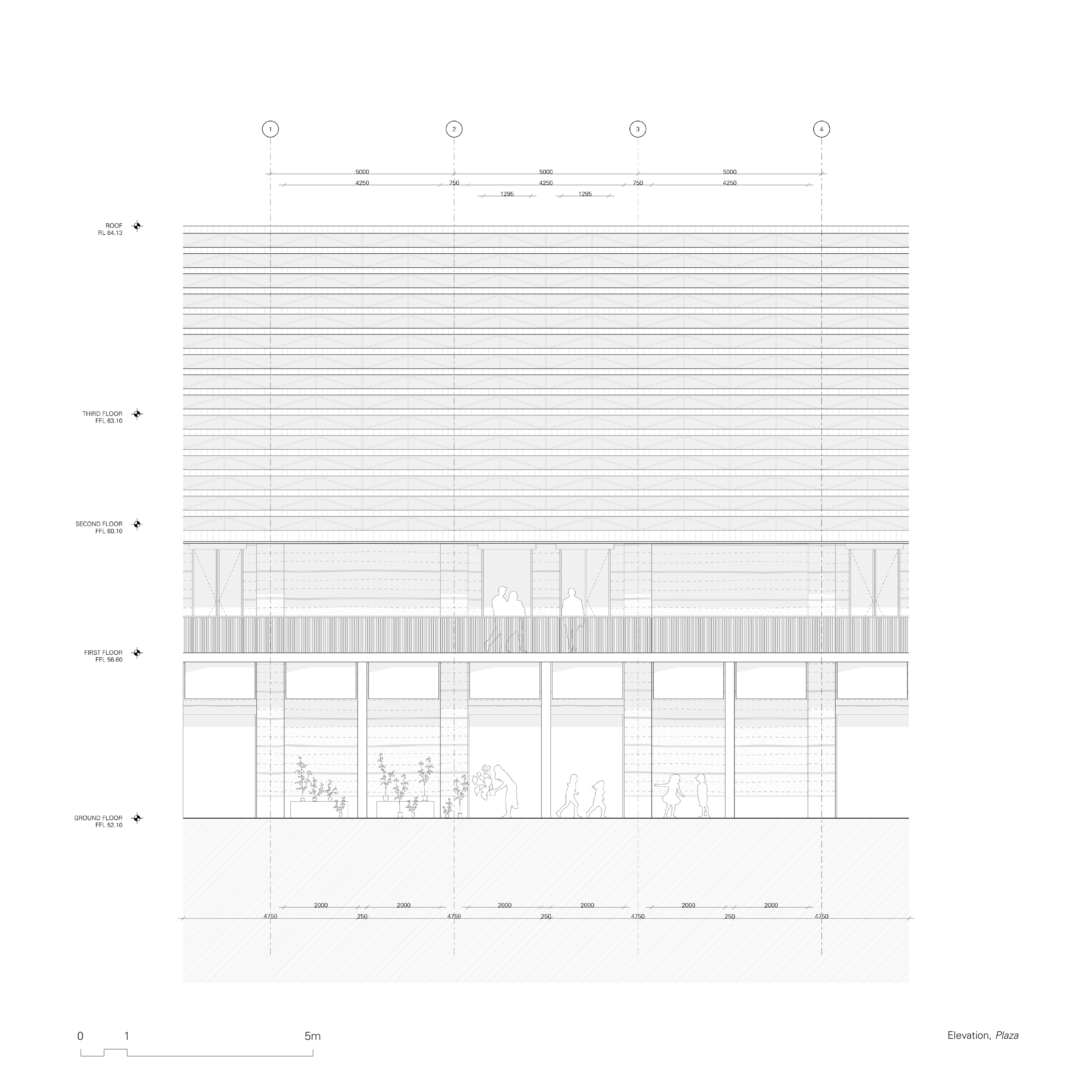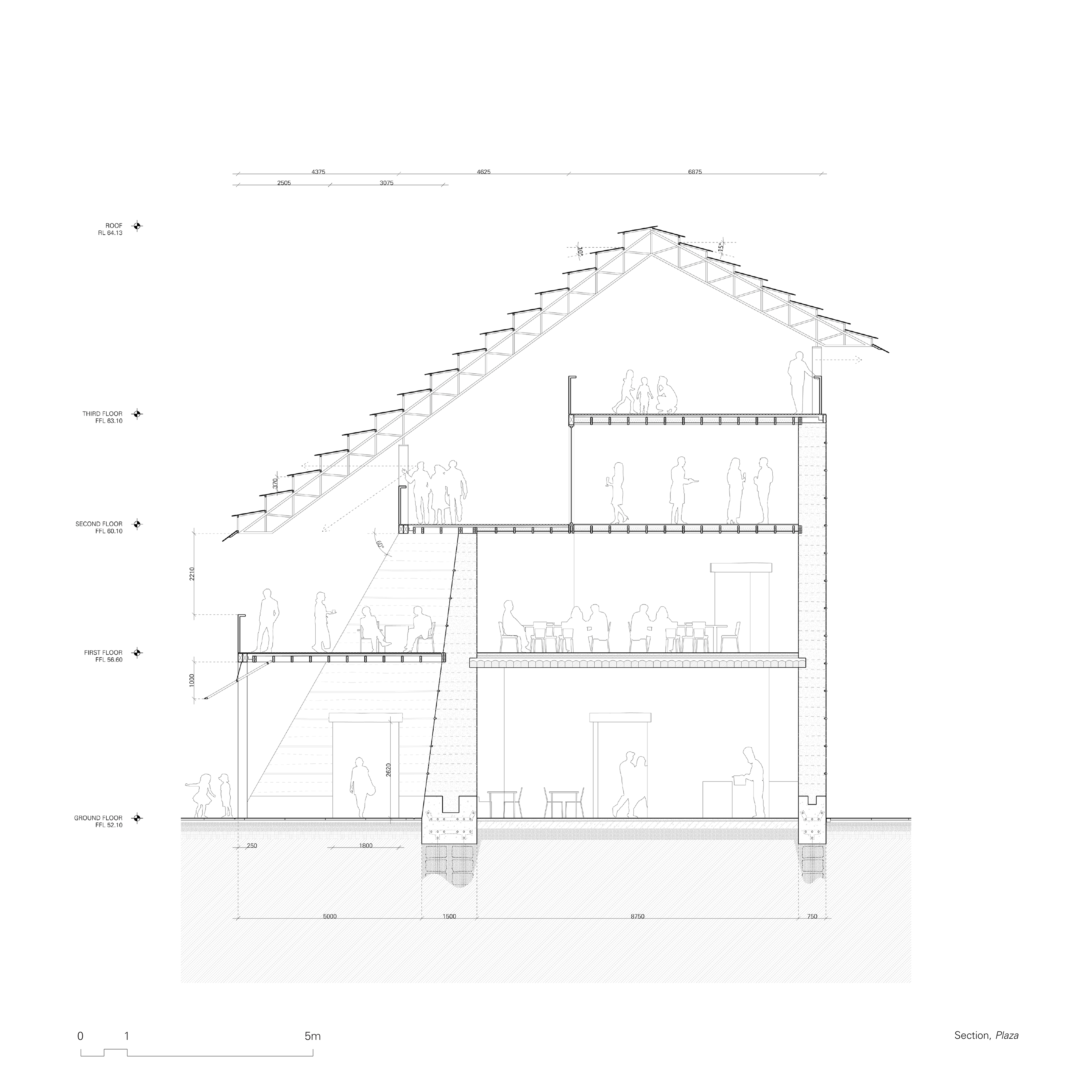 The second and third floor of the plaza building are semi outdoor mezzanine floors and is anticipated to provide sheltered public space. The roof structure, through its angled roof sheets, provides views out onto the public square, creating a visual connection between the two public zones. The second floor has glazed rooms which open up onto the mezzanine, providing amenity for functions and community events. On the third floor, views out to beyond the outer wall maintain the connection between the node its broader environment.