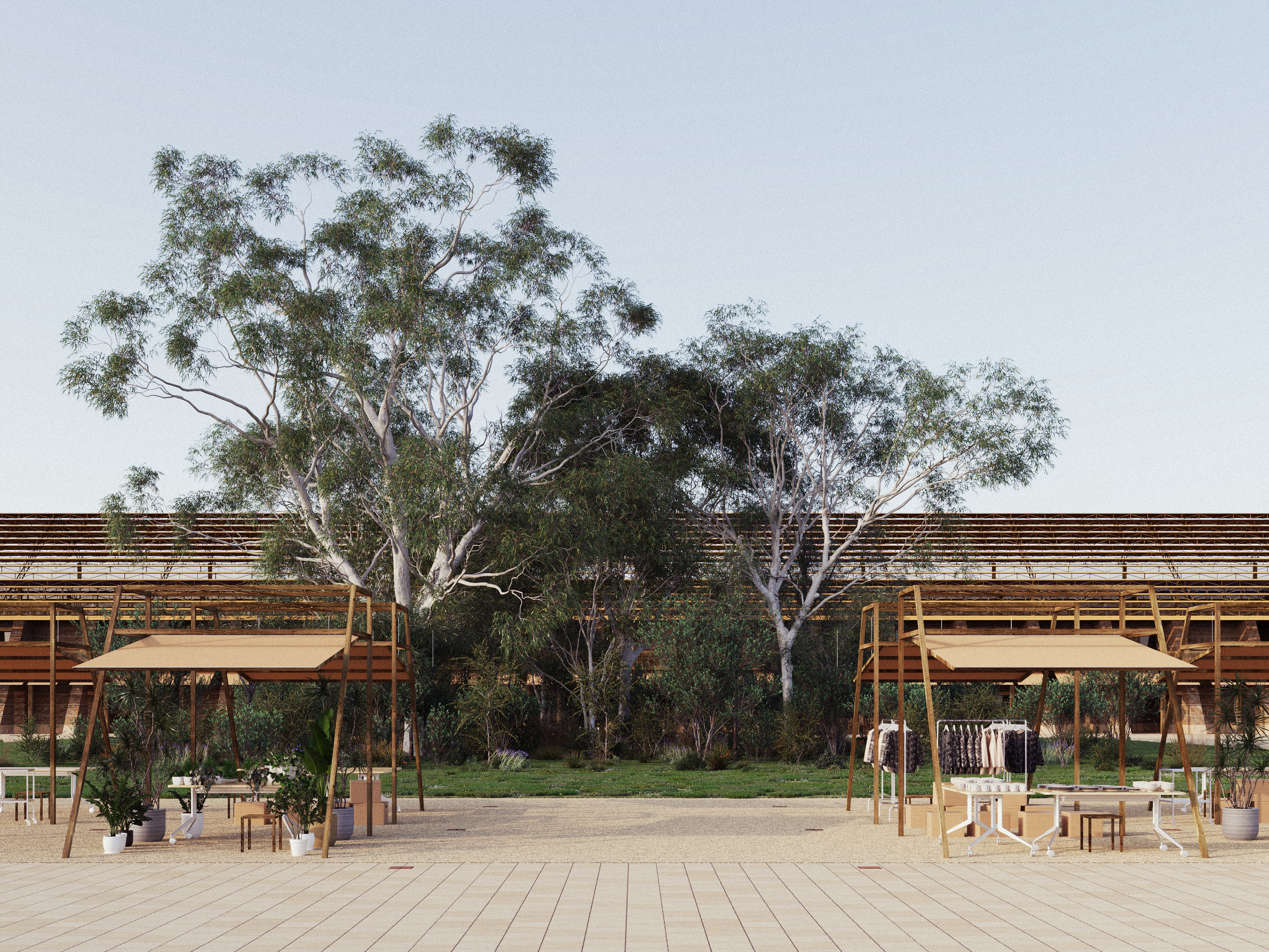 The central plaza is a public space at the core of the project, facilitating various functions integral to the souq. A native garden lies at the core of the public space, its most dense point at the centre, loosening out into a lawn. The perimeter of the temporary market space is outlined by the colonnade of the plaza building. On the ground floor, large, angled blades of rammed earth create a series of outdoor spaces that are sheltered by a fabric awning and deck above. The zone delineated by the blades creates a mediation zone between the open public space of the square and the souqs within the wall.