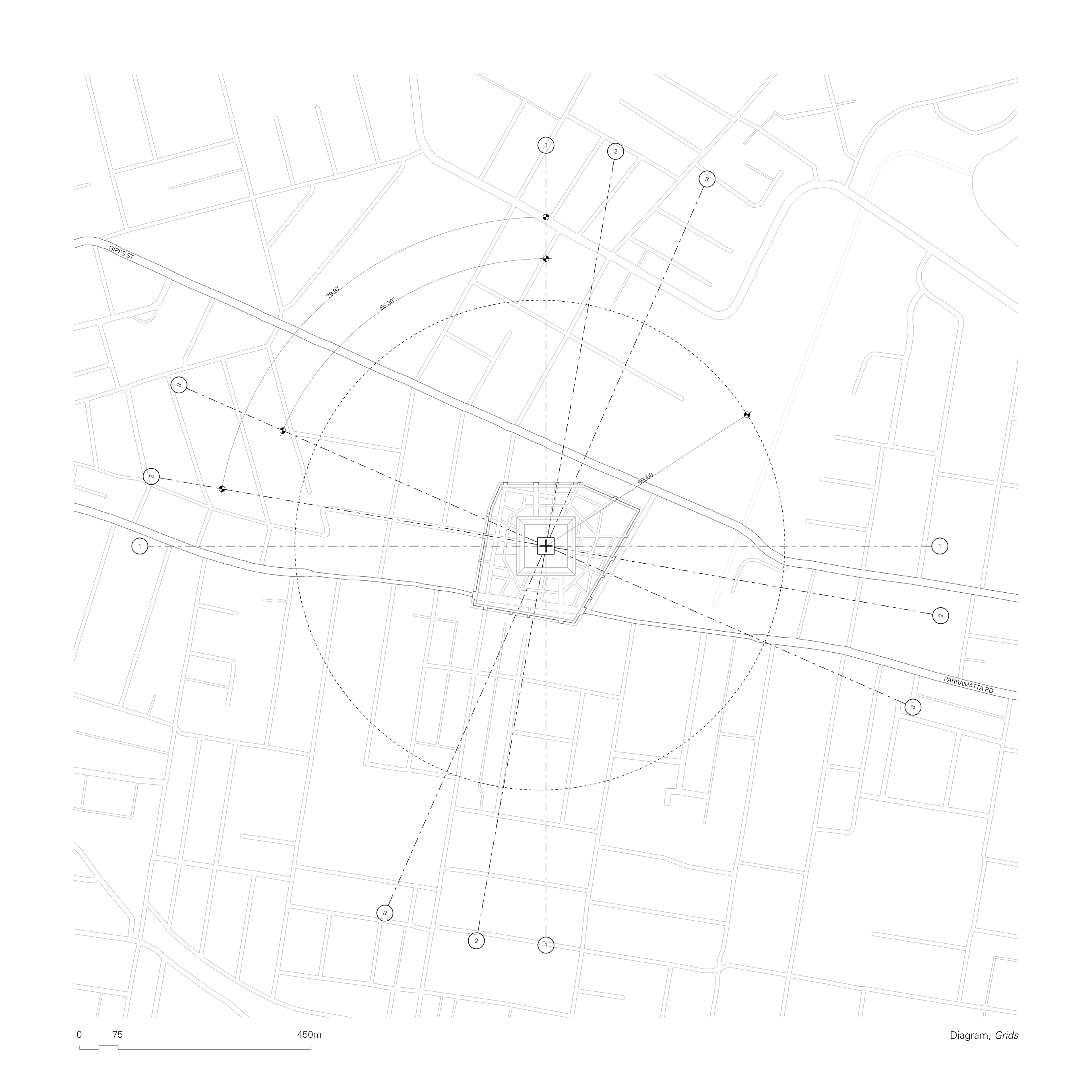 A carefully considered interplay between three primary grids allows the emergence of the complex network of streets which define the project. Envisioning a gradual development, it was important that the proposal would remain amicable to the existing street pattern. The primary grid is set by Parramatta Road, 79.87 degrees to north. As Burwood Road was initially built perpendicularly to Parramatta Road, most of the existing fabric to the south of the proposal follows this set out. The secondary grid is dictated by Gipps’ Street angle, 66.30 degrees to the north, which defines most of existing buildings between the chosen site and the harbour. Additionally, a third grid – aligned to true north – is integrated. Geographic coordinates are specifically important to First Nations cultures as means to create a tangible connection between the built environment and the land, water and skies. In the context of the proposal, it allows us to achieve a strategically crafted relationship between meandering pathways and primary thoroughfares throughout the proposal.