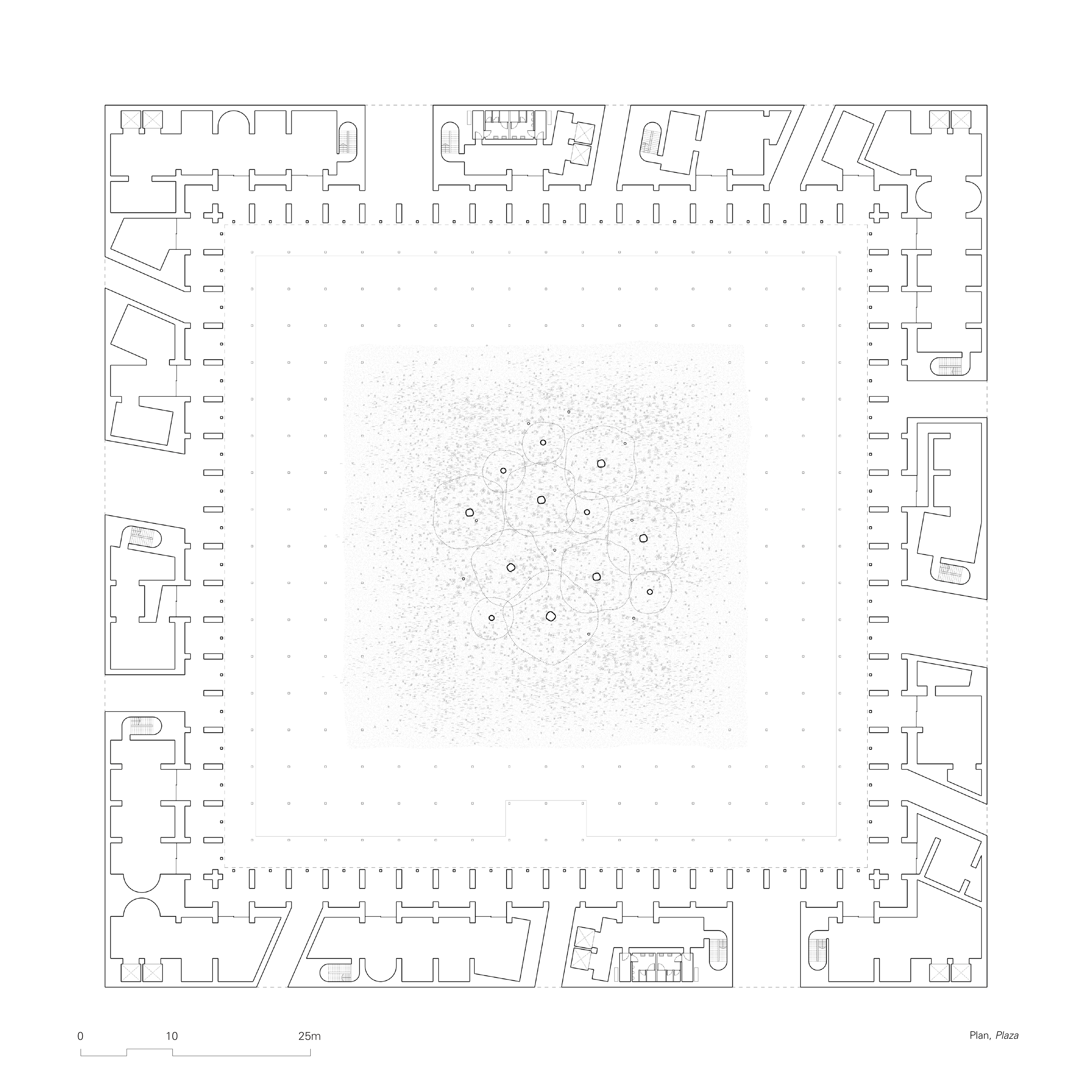 A network of pedestrian pathways inhabits the space between the wall and the square, accommodating activities with a more subtle street engagement. The streets are defined by the human scale, providing an intimate street experience, as well as a residential one.